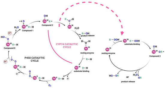 The scheme of catalytic cycles of classical cytochromes P450 and CYP74 enzymes. This figure was created with BioRender.com (accessed on 27 November 2023).