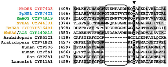 The P450s sequences alignments. The CYP74 family sequences: Nt, N. tabacum; NtDES CYP74D3 NP_001312606.1; Pp, P. patens; PpHPL, CYP74G1, XP_024376101.1; Zm, Z. mays; ZmAOS, CYP74A19, ACG28578.1; Nv, N. vectensis (Metazoa); NvEAS CYP443D1, ASS83181.1; Es, E. siliculosus (brown alga); EsEAS, CYP5164B1, A0A1L3HS58.1; Bb, B. belcheri BbEAS/AOS CYP440A18, XP_019641998.1 The P450 monooxygenases sequences: At, A. thaliana; CYP51G1 NP_172633.1, CYP71B21 KAG7626632.1; Homo sapiens (Human) CYP2D6 ABB01371.1, CYP5a1 AAF99279.1; Rattus norvegicus (Rat) CYP2A1 P11711.2; B. lanceolatum (lancelet) CYP11A1 CAH1250563.1. Alignment was performed using Vector NTI 11 program (Invitrogene, USA). The conservative haem-binding cysteine residue is marked with the triangle.