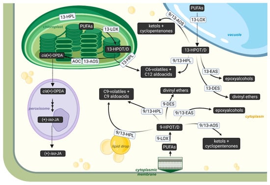 Scheme of intracellular compartmentalization of 9- and 13-LOX pathways in plant cells based on combined data on the localization of 9- and 13-LOX pathways collected from various plant species (A. thaliana, C. sativus, H. vulgare, M. truncatula, P. argentatum, P. inflata, S. lycopersicum, S. tuberosum, V. vinifera, etc.) [160,161,162,163,164,165,166,167,168,169,170,171,172,173,174]. AOC—allene oxide cyclase; cis(+)-OPDA—cis-(+)-12-oxo-phytodienoic acid; (+)-7-iso-JA—(+)-7-iso-jasmonoyl-L-isoleucine. This figure was created with BioRender.com (accessed on 27 November 2023).
