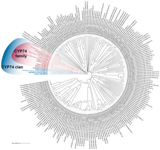 Phylogenetic tree of the P450s of C. sativus (Cs), S. moellendorffii (Sm), N. vectensis (Nv) and E. siliculosus (Es). Enzymes of the CYP74 family are highlighted in red and enzymes of the CYP74 clan are highlighted in blue. Enzymes characterized in our studies are indicated in bold. The evolutionary history was inferred using the Neighbor-Joining method. Evolutionary analyses were conducted in MEGA7. The iTOL tool (https://itol.embl.de/) was used to visualize the phylogenetic model output.