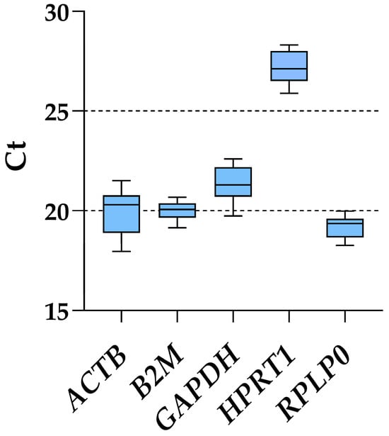 Considering all ASC samples, regardless of inflammatory priming or starvation, RPLP0 had the lowest Ct values and, therefore, the highest amount (mean Ct across all conditions of 19.20 ± 0.53), whereas HPRT1 was the candidate with the most reduced presence (27.11 ± 0.71) (Figure 2 and Table 1). ACTB was the gene with the highest fluctuation between the lowest and highest Ct values, with a delta of 3.54, while B2M and RPLP0 had the smallest (1.53 and 1.73, respectively). This was mirrored by the ranking of the standard deviation values: B2M (0.44), RPLP0 (0.53), HPRT1 (0.71), GAPDH (0.81) and ACTB (1.03). Of note, the results of the five genes under study were not influenced by co-regulation in their expression, since ACTB is located on chromosome (chr) 7, B2M on chr15, HPRT1 on chrX, and GAPDH/RPLP0 at the opposite extremities on chr12, unlikely belonging to the same cluster [].