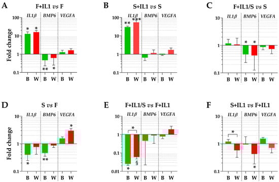 The expression levels of three genes (IL1β, BMP6 and VEGFA), whose soluble products are involved in OA phenotype at different levels, were tested using the best (B) or the worst (W) HKGs identified in Table 3. Regarding the conditions defined by ASCs cultured in FBS (F) and the counterpart under inflammatory stimuli (F+IL1), the presence of IL1β was able to significantly upregulate its own expression and reduce the BMP6 amount (fold change ≥ 2 or ≤ 0.5 and p-value ≤ 0.05, Figure 4A), while VEGFA did not show modulation. A comparable IL1β modulation also emerged for the identical comparison in starvation (S+IL1 vs. S) (Figure 4B), while BMP6 and VEGFA did not change. Of note, the best and worst HKGs had similar results, with the loss of a point of significance for BMP6 for FBS cultured cells and the gain of a point of significance for IL1β for starved ASCs. Similarly, for ASCs cultured in starvation regardless of the absence (S) or presence of IL1β (F+IL1/S) during expansion with FBS, the analysis conducted with the two opposite HKGs did not result in significant differences (Figure 4C), with BMP6 reduced in its expression for cells pre-cultured with IL1β. The situation changed for the comparison of cells cultured in FBS (F) and starvation (S) (Figure 4D). The use of the most reliable HKG allowed to detect a significant downregulation of both IL1β and BMP6 under starvation, that disappeared with the worst HKG. Conversely, VEGFA passed from unchanged to apparently significantly altered. In a similar comparison, when inflamed samples in FBS (F+IL1) were considered as milestone, IL1β was downregulated in starvation (F+IL1/S) with the best HKG, while with the worst one, it lost its significance (Figure 4E). Again, the use of the less stable HKG suggested an apparent and albeit not significant upregulation of VEGFA. Eventually, the presence of IL1β in either FBS (F+IL1) or starvation (S+IL1) never resulted in gene expression differences with the best HKG, while with the worst reference gene, BMP6 appeared significantly downregulated in the absence of serum (Figure 4F).