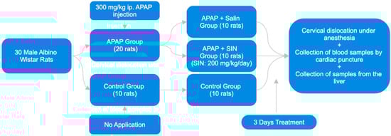 In the current study, thirty male Wistar albino rats were utilized as subjects. The rats were divided into three groups using a random system. A normal control group of ten rats was given no medication at any point in the experiment. A single dose of APAP at 300 mg/kg was administered intraperitoneally (i.p.) to twenty rats. Randomly, these rats were divided into two groups. The I.P. administration of 1 mL/kg/day of 0.9% NaCl saline was administered to ten rats in Group 1 (APAP + Saline) for three days. The I.P. administration of 200 mg/kg/day of SIN was administered to ten rats in Group 2 (APAP + SIN) for three days.