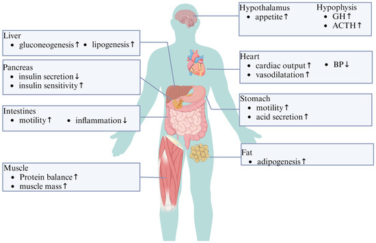 - Akalu, Y.; Molla, M.D.; Dessie, G.; Ayelign, B. Physiological Effect of Ghrelin on Body Systems. Int. J. Endocrinol. 2020, 2020, 1385138. [Google Scholar] [CrossRef]