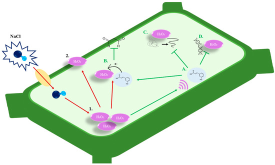 The role of phenolic acids in controlling plant responses to abiotic stress has received considerable attention, with findings demonstrating that phenolic acids and their derivatives are rapidly triggered by a variety of stressors such as salinity (NaCI) stress [11,34,35]. The accumulation of NaCI concentration can increase oxidative stress by directly producing ROS molecules such as H2O2, which can trigger plant programmed cell death [36]. As a result, maintaining low levels of H2O2 is important for cell tolerance to environmental stress. Figure 2 hypothetically illustrates the impact of salt (NaCI) upon entering the cell, where red arrows indicate NaCI-induced oxidative damage and green arrows illustrate the HCA-induced alleviation of NaCI-induced H2O2 accumulation damage. H2O2 induces signaling responses as well as signal molecules such as calcium (Ca2+), salicylic acid (SA), abscisic acid (ABA), jasmonic acid (JA), ethylene, and nitric oxide (NO), functioning together in signal transduction pathways to mediate responses to environmental resistance and regulate plant growth and development. These concentrations of wall-bound phenols may serve as a source of phenylopropanoid units for lignin biosynthesis or perhaps be the start of the lignification process itself [8]. Because of the abundance of bonded molecules in these esters, light energy is transferred, causing changes to the plant cell wall structure, water flow, tugor pressure, and growth [8,21].