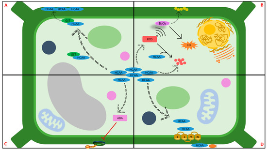A schematic diagram depicting the mechanisms behind hydroxycinnamic acid amide (HCAA) pathogenic suppression. HCAA accumulation has been revealed as a common response to pathogenic infection; however, there are multiple avenues through which HCAA protects the plant cells. (A) A cell-wall strengthening approach, in which HCAAs with the assistance of glutathione S-transferase (GST) are translocated to the plasma membrane, and once at the plasma membrane, the HCAAs can be deposited (and accumulated) on the cell wall. (B) A ROS-mediated approach, in which an accumulation of HCAAs controls cellular ROS levels. HCAAs thus preserve redox homeostasis by being a resource for ROS biosynthesis, while simultaneously serving as radical-scavenging compounds, and in this way preserve redox homeostasis. (C) An ABA-mediated response, in which HCAA is implicated in inducing the ABA-regulation of stomatal opening and closing, to restrict pathogen invasion. (D) A direct attack, by which the multidrug efflux (MATE) transporter facilitates HCAA deposition. The image was generated from [61,62,68].