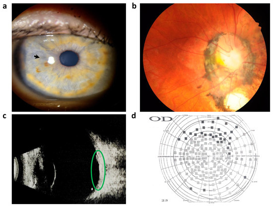 Right eye (OD) visometry showed uncorrected visual acuity of −0.1. Autorefractometry showed sph −0.75, cyl −2.75 ax 101 and a corneal thickness at pachymetry of 562 µm. Pneumotonometry measured the intraocular pressure at −15 mmHg, and biometry indicated an axial length of 21.01 mm. Biomicroscopy revealed a calm conjunctiva and transparent cornea. The anterior chamber depth was within the normal range. In the upper outer quadrant, the iris was structurally changed and slightly hypopigmented, and a radial elliptical anterior iris stromal defect was visualized (Figure 1a), while the crystalline lens was transparent.