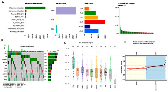 Somatic variant analysis of TCGA-LIHC data. (A) Variants per sample in stacked barplot, with variant types as a box plot; (B) onco plot for the TOP 10 driver genes; (C) driver genes variant allele frequency in the box plot; (D) comparison of the mutation load against the TCGA cohorts.