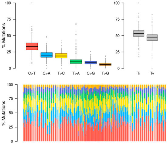 Mutational signatures of liver cancer patients. The functional classification of SNPs is summarized; statistical data were visualized as box plots, with the overall distribution of six different conversions of transitions and transversions.