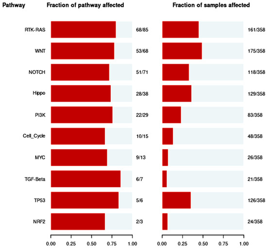 In the present study, ten well-known signaling pathways such as the RTK-RAS, WNT, NOTCH, Hippo, PIK3, Cell Cycle, MYC, TGF-, TP53, and NRF2 were examined. In addition, we examined the processes behind these somatic alterations. Here, using 358 TCGA-LIHC samples with a fraction of mutations in clusters on the X-axis, as displayed in Figure 4, we worked on a framework to design routes evenly. Numerous studies have shown that TCGA-LIHC commonly alters a wide range of significant pathways. More changed pathways, such as 80% RTK-RAS or cell-cycle pathways in numerous tumor types, are also present in tumors with the highest tumor mutation burden. In total, 30% to 50% of the Wnt signaling pathways are caused by the CTNNB1 gene mutation. In 70% of other driver genes, P53 genomic alterations changed gene-centricity as well as intra- and inter-pathway interactions. This pathway particularly responds to immune checkpoint inhibitors and may be enhanced by CD4+ and CD8+ cell infiltrations and immunological categorization of HCC tumors. It might help in the treatment of cancer.