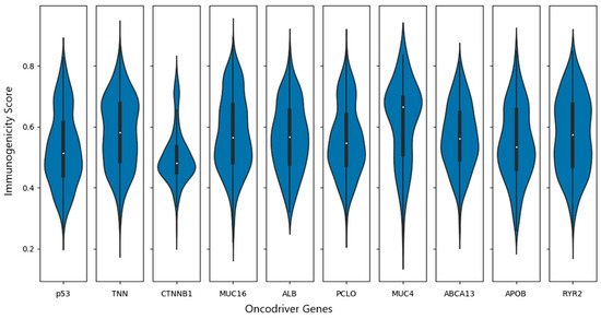 Immunogenicity of recurrent oncogenic genes non-synonymous mutations’ distribution shown in Violin plots. The points show the median values, where 0.8 indicates high immunogenicity, 0.5–0.8 means low immunogenicity, and less than 0.5 is non-immunogenic.