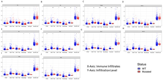 Genetic changes are linked to the growth and spread of tumors, and these changes may have an impact on the immune cells that infiltrate tumors (TIIC). All six immune cell types—B cells, CD8+ T cells, CD4+ T cells, macrophages, neutrophils, and dendritic cells—in their WT and mutant states could be compared with the driver gene somatic mutation. P53 (28%), TNN (25%), CTNNB1 (24%), MUC16 (16%), PCLO (11%), ALB (11%), MUC4 (10), ABCA13 (9%), APOB (9%), and RYR2 (9%) are the 10 most frequently mutated genes. With the use of the dynamic web interface tool TIMER, the mutation module was used to examine the immunological infiltration. The box plots produced for each immune group are shown in Figure 7, where the immune infiltration distribution level of each gene mutation is compared using statistically significant values and a 95% confidence interval, determined using the two-sided Wilcoxon rank sum test.