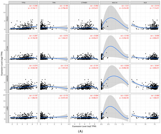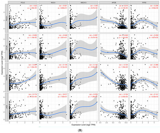 (A). Scatter plots derived from the relationship between the expression of driver genes (TP53, TNN, CTNNB1, MUC16, and ALB) on the X-axis and known immune targets (PDCD1, CTLA4, HAVCR2, and LAG3) on the Y-axis. (B). Scatter plots derived from the association between driver genes (PCLO, MUC4, ABCA13, APOB, and RYR2) and known immunological targets (PDCD1, CTLA4, HAVCR2, and LAG3) on the X- and Y-axes.