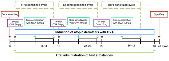 In this study, skin conditions were evaluated after stimulating the skin with OVA, with observations, scoring, and photographing conducted every 3 to 4 days. The scoring of skin conditions followed these criteria: 0 points for no symptoms, 1 point for scratching, 2 points for redness, 3 points for skin damage or flaking, 4 points for mucus or body fluid production, and 5 points for the presence of mucus or body fluids with pus or bleeding.