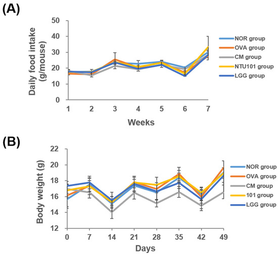 Food intake and body weight during the 7-week experiment. (A) Weekly food intake (g/mouse). (B) Body weight (g/mouse). Each value was expressed as mean ± SD (n = 8). The NOR group (control) received saline and a standard diet. The OVA group underwent sensitization and skin irritation with ovalbumin (OVA) on a normal diet. The CM group had the same OVA treatment plus prednisolone. The NTU 101 group received OVA treatment and NTU 101 at 1 × 1011 CFU/day. The LGG group underwent OVA treatment and received L. rhamnosus GG ATCC 53103 at 1 × 1011 CFU/day.