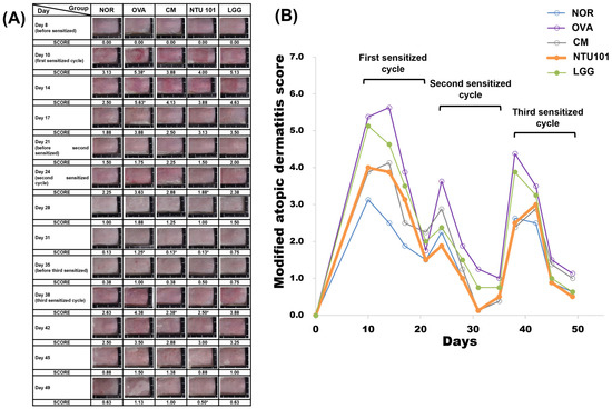 (A) Representative images of sensitized skin sites in EC-sensitized mice. (B) Clinical skin severity scores. Each value was expressed as mean ± SD (n = 8). Statistical comparison of differences between each group: * denotes p-value less than 0.05 (p < 0.05). The NOR group (control) received saline and a standard diet. The OVA group underwent sensitization and skin irritation with ovalbumin (OVA) on a normal diet. The CM group had the same OVA treatment plus prednisolone. The NTU 101 group received OVA treatment and NTU 101 at 1 × 1011 CFU/day. The LGG group underwent OVA treatment and received L. rhamnosus GG ATCC 53103 at 1 × 1011 CFU/day.