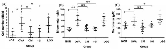 Histological changes in inflammatory cell infiltration (A), epidermal thickness (B), and dermal thickness (C) in each group. H&E staining at 100–200× magnification and 500-micrometer (μm) ruler length. Each value was expressed as the mean ± SD (n = 8). Statistical comparison of differences between each group: * denotes p-value less than 0.05 (p < 0.05); ** denotes p-value less than 0.01 (p < 0.01). The NOR group (control) received saline and a standard diet. The OVA group underwent sensitization and skin irritation with ovalbumin (OVA) on a normal diet. The CM group had the same OVA treatment plus prednisolone. The NTU 101 group received OVA treatment and NTU 101 at 1 × 1011 CFU/day. The LGG group underwent OVA treatment and received L. rhamnosus GG ATCC 53103 at 1 × 1011 CFU/day.
