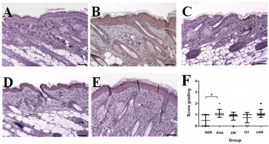 Representative images of TSLP expression in sensitized skin sites of mice. Skin sections were stained using immunohistochemistry for TSLP. Images are shown for the (A) NOR group, (B) OVA group, (C) CM group, (D) NTU 101 group, and (E) LGG group, and (F) results of scoring in each group, examined at an original magnification of 100×. Each value is expressed as mean ± SD (n = 8). Statistical comparison of differences between each group and the OVA group (*: p < 0.05). The NOR group (control) received saline and a standard diet. The OVA group underwent sensitization and skin irritation with ovalbumin (OVA) on a normal diet. The CM group had the same OVA treatment plus prednisolone. The NTU 101 group received OVA treatment and NTU 101 at 1 × 1011 CFU/day. The LGG group underwent OVA treatment and received L. rhamnosus GG ATCC 53103 at 1 × 1011 CFU/day.