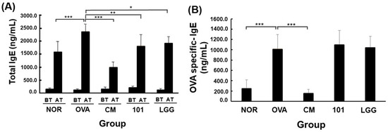 Changes in total IgE (A) and OVA-specific IgE (B) in the serum of each group. Each value was expressed as the mean ± SD (n = 8). Statistical comparison of differences between each group and the OVA group (*: p < 0.05, **: p < 0.01, ***: p < 0.001). The NOR group (control) received saline and a standard diet. The OVA group underwent sensitization and skin irritation with ovalbumin (OVA) on a normal diet. The CM group had the same OVA treatment plus prednisolone. The NTU 101 group received OVA treatment and NTU 101 at 1 × 1011 CFU/day. The LGG group underwent OVA treatment and received L. rhamnosus GG ATCC 53103 at 1 × 1011 CFU/day. BT: before treatment; AT: after treatment.