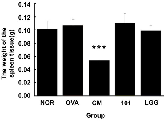 Changes in spleen tissue weight in each group at the end of the experiment. Each value is expressed as mean ± SD (n = 8). Statistical comparison of differences between each group: *** denotes p-value less than 0.001 (p < 0.001). The NOR group (control) received saline and a standard diet. The OVA group underwent sensitization and skin irritation with ovalbumin (OVA) on a normal diet. The CM group had the same OVA treatment plus prednisolone. The NTU 101 group received OVA treatment and NTU 101 at 1 × 1011 CFU/day. The LGG group underwent OVA treatment and received L. rhamnosus GG ATCC 53103 at 1 × 1011 CFU/day.
