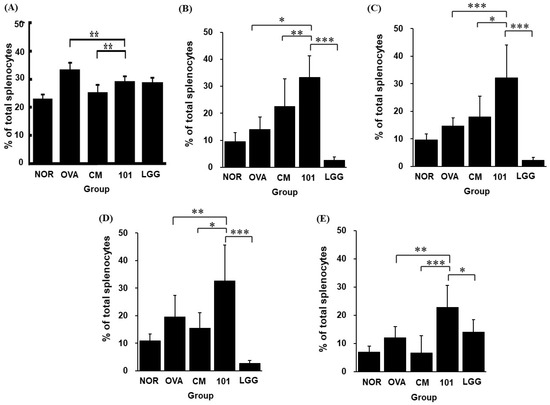 Effects of Lactobacillus paracasei subsp. paracasei NTU 101 on the cell proportions of (A) dead splenocytes, (B) CD4+/IFN-γ+, (C) CD4+/IL-4+, (D) CD4+/IL-17+, and (E) CD4+/CD25+/FOXP3+ in splenocytes from EC-sensitized mice. Each value is expressed as mean ± SD (n = 8). Statistical comparison of differences between each group: * denotes p-value less than 0.05 (p < 0.05); ** denotes p-value less than 0.01 (p < 0.01); *** denotes p-value less than 0.001 (p < 0.001). The NOR group (control) received saline and a standard diet. The OVA group underwent sensitization and skin irritation with ovalbumin (OVA) on a normal diet. The CM group had the same OVA treatment plus prednisolone. The NTU 101 group received OVA treatment and NTU 101 at 1 × 1011 CFU/day. The LGG group underwent OVA treatment and received L. rhamnosus GG ATCC 53103 at 1 × 1011 CFU/day.
