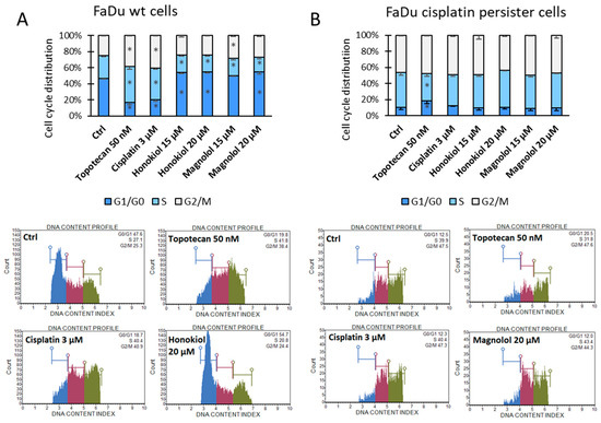 Cell cycle distribution analysis after propidium iodide (PI) staining in (A) FaDu wild-type (wt) cells and (B) FaDu cisplatin persister cells. The cells were incubated with cisplatin, honokiol, or magnolol for 48 h. Topotecan was used as the positive control of cell cycle arrest. Exemplary flow cytometry plots are shown. The blue area denotes the G1/G0 phases, the red area denotes the S phase, and the green area denotes the G2/M phases of the cell cycle. The results represent mean values ± SD from three independent experiments. The asterisk (*) denotes statistically significant differences in comparison to DMSO control (Ctrl) for each cell cycle phase, p ≤ 0.05.