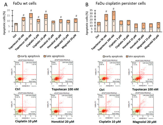 Apoptosis induction analysis after Annexin V and 7-amino actinomycin D staining in (A) FaDu wild-type (wt) cells and (B) FaDu cisplatin persister cells. The cells were incubated with cisplatin, honokiol, or magnolol for 48 h. Topotecan was used as the positive control. Exemplary flow cytometry plots are shown. The results represent mean values ± SD from three independent experiments. Statistically significant differences in comparison to DMSO control (Ctrl) for early and late apoptosis are represented by an asterisk (*), while for total apoptotic cells, the hash (#) was used, p ≤ 0.05.
