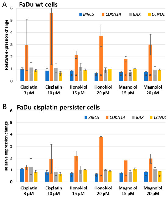 The results of the analysis of the changes in the level of expression of BIRC5, CDKN1A, BAX, and CCND1 genes in (A) Fadu wt and (B) FaDu cisplatin persister cells. The cells were incubated with cisplatin, honokiol, or magnolol for 48 h. The results represent fold–change mean values ± SD from two independent experiments. The asterisk (*) inside bars denotes statistically significant differences in comparison to DMSO control, p ≤ 0.05.