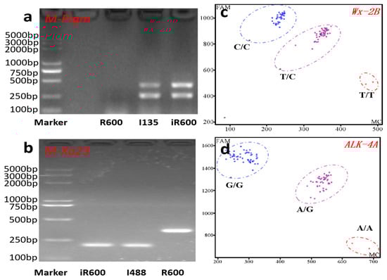 Molecular marker-assisted selection in this study. (a) Polymorphism analysis of Pigm among recurrent parent R600, donor parent I135, and improved line iR600. The double bands indicated the presence of the Pigm locus from the donor parent I135. (b) Polymorphism analysis of Xa23 among R600, I488, and iR600. The band genotype of Xa23 in I488 and iR600 was significantly smaller than that of R600. (c,d) KASP genotyping results of Wx and ALK. The blue circle represents the homozygous allele derived from the donor parent HHZ, while the purple circle signifies heterozygosity, and the red circle denotes alleles originating from R600.