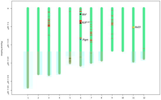 The Affymetrix rice 8K chip, comprising 6933 high-quality SNP markers evenly distributed across the 12 chromosomes of rice, was utilized to compare the genetic background between the improved line iR600 and recurrent parent R600. The total DNA was extracted from leaf samples of 2-week-old rice seedlings. The rice 8K chip assay was performed by China Golden Marker (Beijing, China) Biotechnology Co., Ltd. (Beijing, China) according to the methods previously described [32].