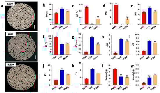 Analysis of grain appearance quality in improved lines. (a) The appearance of head rice. Scale bar, 1 cm. (b) HD, analysis of head rice (n = 3). (c) CGP, analysis of chalky grain percentage (n = 3). (d) CGG, analysis of chalky grain grade (n = 3). (e) LWR, analysis of length–width ratio (n = 10). (f) AC, analysis of amylose content (n = 3). (g) GC, analysis of gel consistency (n = 3). (h) ASV, analysis of alkali spreading value (n = 3). (i) CTS, analysis of comprehensive taste score (n = 3). (j) AS, analysis of appearance score (n = 3). (k) TS, analysis of taste score (n = 3). (l) Analysis of hardness (n = 3). (m) Analysis of viscosity (n = 3). The significant comparison object is R600. A two−tailed Student’s t-test was used to generate p-values. ** indicate a significant difference at p < 0.01; Values are means ± SD. Error bars represent SDs.