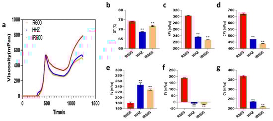 The RVA characteristic curves of improved lines. (a) The RVA characteristic curves. (b) GT, analysis of gelatinization temperature (n = 3). (c) HPT, analysis of hot paste viscosity (n = 3). (d) CPT, analysis of cool paste viscosity (n = 3). (e) BV, analysis of breakdown values (n = 3). (f) SV, analysis of setback values (n = 3). (g) CV, analysis of consistency values (n = 3). The significant comparison object is R600. A two−tailed Student’s t-test was used to generate p-values. ** indicate a significant difference at p < 0.01. Values are means ± SD. Error bars represent SDs.