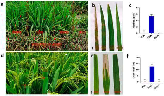 Evaluation and analysis of disease resistance of improved lines. (a) Rice blast is naturally induced. (b) Incidence of leaf blast. Scale bar, 1 cm. (c) Disease analysis of rice blast (n = 3). (d) Bacterial blight inoculation. (e) Incidence of bacterial blight. Scale bar, 1 cm. (f) Analysis of leaf blight spot length (n = 10). The significant comparison object is R600. The red arrow represents the inoculated leaves. A two−tailed Student’s t-test was used to generate p-values. ** indicate a significant difference at p < 0.01. Values are means ± SD. Error bars represent SDs.