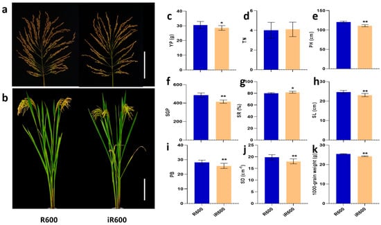 Evaluation of main agronomic characters in improved lines. (a) Main panicles. Scale bar, 10 cm. (b) Plant morphology. Scale bar, 20 cm. (c) YP, yield per plant (n = 10). (d) TN, tiller number (n = 10). (e) PH, plant height (n = 10). (f) SGP, spike grain per panicle (n = 10). (g) SR, setting rate (n = 10). (h) SL, spike length (n = 10). (i) PB, primary branches (n = 10). (j) SD, spikelet density (n = 10). (k) 1000-grain weight (n = 10). The significant comparison object is R600. A two−tailed Student’s t-test was used to generate p-values. * and ** indicate a significant difference at p < 0.05 and 0.01. Values are means ± SD. Error bars represent SDs.