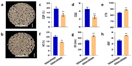Analysis of rice quality in hybrid combinations. (a) Whole-milled rice appearance of 608A/R600. Scale bar, 1 cm. (b) Whole-milled rice appearance of 608A/iR600. Scale bar, 1 cm. (c) CGP, chalky grain percentage of hybrid combinations (n = 3). (d) CGG, chalky grain grade of hybrid combinations (n = 3). (e) CTS, comprehensive taste score of hybrid combinations (n = 3). (f) AC, amylose content of hybrid combinations (n = 3). (g) GC, gel consistency of hybrid combinations (n = 3). (h) ASV, alkali spreading value of hybrid combinations (n = 3). The significant comparison objects are the cross combinations of R600 corresponding to male sterile line. A two-tailed Student’s t-test was used to generate p-values. ** indicate a significant difference at p < 0.01. Values are means ± SD. Error bars represent SDs.