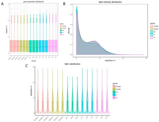 The results of three repeated biological tests indicated that the gene expression level distribution among the different genotypes was similar. With the exception of a slight difference in the parental line W1767, the median and the degree of dispersion of the gene expression level distribution of the four genotypes of hybrids EC338, EC333, P9060, and H1522 were relatively similar (Figure 1A,C). Therefore, the potential for differential gene screening due to the amount of gene expression can be ruled out. The peak of the FPKM density distribution curve is commonly used to analyze the gene expression level in RNA sequencing data. The peaks of the curves represent the most common FPKM values in the dataset and can provide information about the gene expression patterns. The FPKM values were calculated by dividing the number of fragments mapped to a gene by the length of the gene and the total number of mapped reads and then normalizing this to the library size.