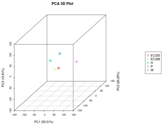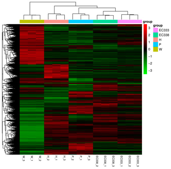 The expression trends of the differential gene sets in P9060 and EC338 were similar. However, the expression trend of W1767 was opposite that of EC338 (Figure 5). The similarity of the expression levels and the advantage of the stress resistance of E. pellita suggested that genes with significantly different expression are likely to be related to disease resistance. The expression levels of pigment genes in differently colored feather follicles were analyzed by Zheng et al., and they showed that the genetic regulation of tail feather color was independent of body plumage color [41]. The optimal genetic models were inconsistent among different lignans in the same organ and between different organs for the same lignan, which may be associated with specific gene expression patterns [42]. Abtahi et al. indicated that seed color is primarily determined by maternal genotype, but the parents’ genetic constitution determines this characteristic’s expression [43].