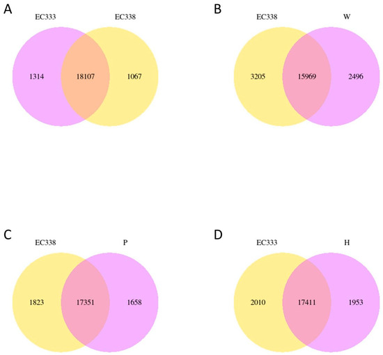 Gene co-expression Venn diagram in eucalypt genotypes tested. (Venn diagram shows the overlap of differentially expressed genes between different comparison combinations. (A) Venn diagram of co-expressed genes EC338 vs. EC333. (B) Venn diagram of co-expressed genes EC338 vs. W1767. (C) Venn diagram of co-expressed genes EC338 vs. P9060. (D) Venn diagram of co-expressed genes EC333 vs. H1522.).