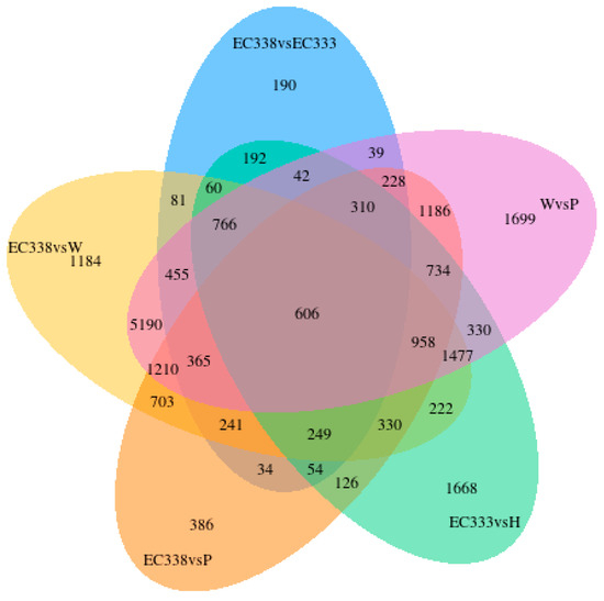 There were 18 107 differential genes between EC338 and EC333 (Figure 3A) and 15,969 differential genes between EC338 and W1767 (Figure 3B). A total of 17,351 differential genes were identified between EC338 and P9060 (Figure 3C). Therefore, the target resistance genes might be shared by these three gene sets. In addition, genes can interact additively or reciprocally, causing the function of recessive disease susceptibility genes in a parent to become visible in their hybrids. The female parent (H1522) of EC333 is not susceptible to leaf blight, while the male parent is unknown, so its susceptibility might be attributed to gene recombination in the cross. It is unclear whether the 17,411 differential genes between EC333 and H1522 (Figure 3D) were associated with susceptibility or not. The differential gene Venn diagram clearly compares the differential genes of the multiple combinations. The sum of all the numbers in the circle represents the total number of differential genes in the comparison combination, and the overlapping area represents the common differential genes between the combinations. The four pairs of comparison groups described above (EC338 vs. EC333, EC338 vs. W1767, EC338 vs. P9060, and EC333 vs. H1522) were distinguished by 2143 common differential genes (Figure 4), indicating that these genes were likely associated with resistance to eucalypt leaf blight.