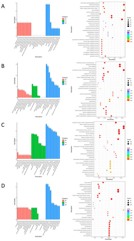The GO enrichment analysis indicates that the differentially expressed gene pathways of EC338 (resistant) and EC333 (susceptible) predominantly involve carbohydrate binding, pattern binding, and polysaccharide binding (Table 2 and Figure 6A). These pathways might be key to endowing hybrids with disease resistance advantages, with carbohydrate binding demonstrating the highest probability, because this pathway existed in four pairs of the comparison groups, and only carbohydrate binding displayed ‘details’. Terpene synthase activity and carbon–oxygen lyase acting on phosphates were present in three pairs of genotypically differentially expressed pathways (Table 2, Figure 6B–D). The carbohydrate binding (Table 2, Figure 6A,D) and carbon–oxygen lyase activity (Table 2, Figure 6B,D) gene pathways were detected in two of the genotype pairs compared.