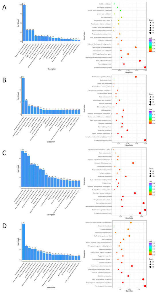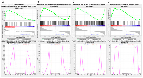 GSEA using KEGG annotations. (Here, the legend is the same as that for Figure 8. (A) Sesquiterpenoid and triterpenoid biosynthesis. (B) Phenylpropanoid biosynthesis. (C) Plant–pathogen interaction. (D) Flavonoid biosynthesis.).