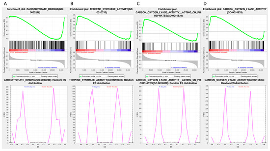 GSEA using GO annotations. (The top row is a snapshot of the enrichment results. The enrichment map displays the green ES line graph at the top, revealing the highest peak at the ES value denoting the gene set ES value. In the hits barcode map located in the middle, the leading-edge subset represents the genes that make the most significant contribution to the enrichment score, ranging from 0 to the ES value. The top grayscale enrichment of the bottom sorting level value indicates the level of genotype expression. The distribution plot in the bottom row illustrates that if the final ES value (marked by the black dotted line) is relatively small, the pathway gene set is randomly distributed, whereas a relatively large ES value suggests non-random distribution. Subsequently, the hypothesis regarding substitution is then examined. (A) Carbohydrate binding. (B) Terpene synthase activity. (C) Carbon–oxygen lyase acting on phosphates. (D) Carbon–oxygen lyase activity.).
