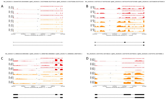 The current study identified the exon skipping events (SEs) with the most significant IncLevelDifference values in two samples from a pool of the top 20 with the lowest false discovery rate (FDR) from four comparison groups: EC338 vs. EC333, EC338 vs. P9060, EC338 vs. W1767, and EC333 vs. H1522. It was concluded that the gene LOC104426602 exhibited differential alternative splicing between EC338 and EC333 (Figure 10A), as did LOC104435785 between EC338 and P9060 (Figure 10B) and LOC104448051 between EC338 and W1767 (Figure 10C). Among the various genes with an IncLevelDifference absolute value of 1 in EC333 vs. H1522, the exon skipping isoform LOC104418168 was the only one expressed in this differential comparison group (Figure 10D). It is worth noting that LOC104426602, LOC104435785, and LOC104418168 had a high count of exon skipping isoforms, whereas LOC104448051 had a number of exon inclusion isoforms. The substantial differences in the alternative splicing events between the two distinct resistant hybrids could result in variations in the transcript and protein structures, as well as functional polymorphisms. Consequently, it was possible that the four genes mentioned are associated with resistance to eucalypt leaf blight.