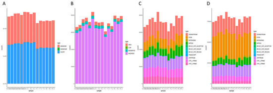 SNP variant loci region statistics. (The horizontal coordinates represent the samples. (A) histogram of each sample variant loci categorized based on function (SNP_function). (B) histogram of this by impact (INDEL_impact). (C) histogram of this by region (INDEL_region). (D) histogram of this by region (SNP_region).).