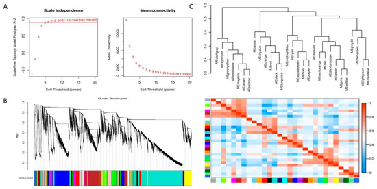 Module division in WGCNA analysis. (A) Soft threshold plot. In the left plot, the horizontal coordinate is the soft threshold, and the vertical coordinate is the correlation between connectivity k and p (k). The right plot is the soft threshold versus the average connectivity of the network. (B) Module hierarchical clustering tree. The branches are gene modules, and the leaves are genes. Merged colors are the modules with dissimilarity coefficients less than 0.25 merged with colors to represent the different modules. (C) Inter-module correlation heatmap. The top part of the plot is the clustering based on the module’s eigenvalues, and the values of the vertical coordinates correspond to the similarity between different modules. The upper part is the clustering based on the module eigenvalues, and the value of the vertical coordinate is the similarity between different modules. The lower part is the clustering heatmap between different modules; each row and column in the graph represents one module. The darker the color (redder) in the box, the stronger the correlation; the lighter the color of the box, the weaker the correlation.