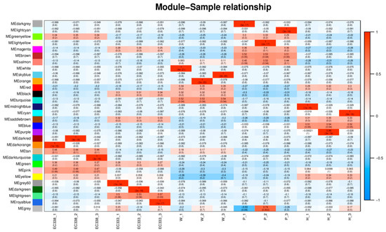 Heatmap of genotype and inter-module correlations in eucalypt genotypes. (The horizontal axis, known as the abscissa, denotes the sample, while the vertical axis, referred to as the ordinate, represents the module. Each cell in the grid contains a numerical value indicating the correlation between the module and the sample. A value closer to 1 signifies a more robust positive correlation between the module and the sample, whereas a value nearing −1 indicates a stronger negative correlation. The degree of negative correlation strength is proportional to the value. Additionally, the significance level, denoted by the value in parentheses, reflects the strength of significance, with smaller values indicating higher significance.).
