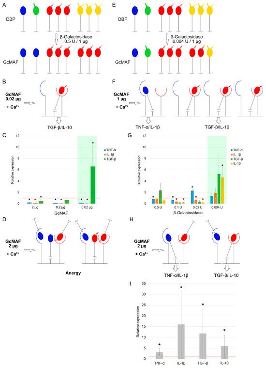 A putative visual schematic diagram showing the effect of co-dependence between the amount of β–galactosidase enzyme used to produce anti-GcMAF from the DBP precursor in solution and the amount of DBP precursor per se on induction of PMs toward mRNA synthesis of the cytokines being analyzed. A graphical representation of the structural (core) elements used to visualize the interaction between various glycosylated forms of DBP/GcMAF and the CLEC10A complex receptor is provided in Supplementary Figure S1. (A) A schematic diagram of anti-GcMAF production by converting 1 μg of DBP in the mode “an excessive amount of enzyme per 1 μg of DBP”. (B,C) For inducing PMs toward synthesis of anti-inflammatory cytokines, the amount of GcMAF produced in the specified mode needs to be 0.02 μg for the cultivation conditions specified in the Materials and Methods section. The green background indicates the mode that produces the anti-inflammatory properties of GcMAF. (D) A schematic diagram of inhibition of mRNA synthesis of both pro- and anti-inflammatory cytokines by PMs using an excessive amount of ligand with respective characteristics (2 μg). (E) A schematic diagram of anti-GcMAF production by converting 1 μg of DBP in the mode “insufficient amount of enzyme per μg of DBP”. (F,G) For inducing PMs toward synthesis of anti-inflammatory cytokines, the amount of GcMAF produced in the specified mode needs to be 1.0 μg for the cultivation conditions specified in the Materials and Methods section. The green background indicates the mode that produces the anti-inflammatory properties of GcMAF. (H) A schematic diagram of the interaction between the specified amount of GcMAF preparation and CLEC10A on PMs. (I) The outcome of mRNA synthesis of analyzed cytokines by PMs for the selected conditions upon excessive amount of the ligand having respective characteristics (2 μg). All the experiments were conducted in the presence of 2 mM Ca2+. The results are presented based on the data obtained in three independent experiments. The mRNA expression level in PMs cultured in RPMI−1640 medium assumed to be equal to unity (red solid line) is used as a control. The statistically significant differences compared to the control are denoted as: *—p < 0.05, the Mann–Whitney U test.