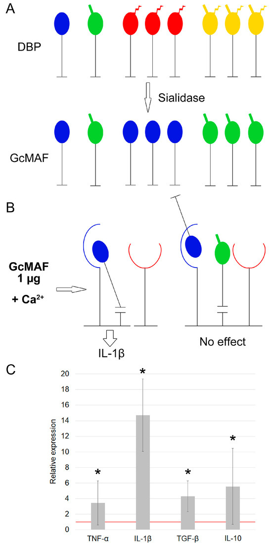 A schematic diagram of the putative mechanism of interaction between pro-GcMAF produced by treatment with two enzymes (β–galactosidase and sialidase) in the solution and CLEC10A, resulting in synthesis of mRNA of analyzed cytokines. A graphical representation of the structural (core) elements used to visualize the interaction between various glycosylated forms of DBP/GcMAF and the CLEC10A complex receptor is provided in Supplementary Figure S1. (A) Production of pro-GcMAF carrying a totally open GalNAc moiety by treating all the DBP variants with β–galactosidase and sialidase. (B) At a sufficiently high Ca2+ concentration, the epitopes of specific Ca2+ -dependent 63/65 kDa high-molecular-weight derivatives of the CLEC10A receptor “open up”. When concentration of pro-GcMAF ligand is insufficient, the macrophage-activating factor carrying a terminal GalNAc moiety (shown in blue GalNAc) is bound to both the 29 kDa and 65 kDa derivatives. The complex is internalized into the cytoplasm, and synthesis of proinflammatory cytokines (IL-1β) is activated (the left-hand side of the diagram). Excessive concentration of pro-GcMAF ligand results in competition between the 29 kDa “anchor” derivative and the 65 kDa high-molecular-weight CLEC10A derivative. It is hypothesized that if the doubly bound complex between the ligand and the 29 kDa + 63/65 kDa “anchor” derivatives cannot be formed and internalized into the cytoplasm, cytokine synthesis is inhibited (the right-hand side of the diagram). (C) Quantification of mRNA expression of pro- and anti-inflammatory cytokine genes in murine peritoneal macrophages activated by pro-GcMAF at a dose of 1 µg per 5 × 105 PMs. The mRNA expression level in PMs cultured in RPMI−1640 medium assumed to be equal to unity (red solid line) is used as a control. The statistically significant differences compared to the control are denoted as: *—p < 0.05, the Mann–Whitney U test.