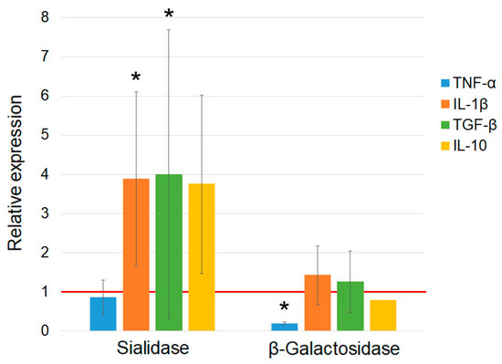 Quantification of mRNA expression of the genes of pro- and anti-inflammatory cytokines by PMs activated with pure sialidase and β–galactosidase enzymes at doses corresponding to 15 mU per 5 × 105 PMs. The mRNA expression level in PMs cultured in RPMI medium assumed to be equal to unity (red solid line) is used as a control. The statistically significant differences compared to the control are denoted as: *—p < 0.05, the Mann–Whitney U test.