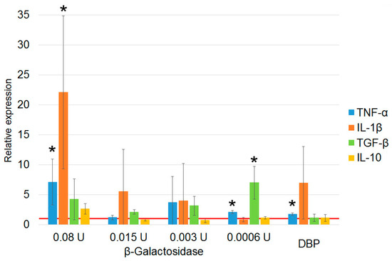 Quantification of mRNA expression of the genes of pro- and anti-inflammatory cytokines by PMs activated using four anti-GcMAF preparations produced by DBP conversion using several β–galactosidase doses: 0.08 U, 0.015 U, 0.003 U, and 0.0006 U per µg of protein “directly on resin” and intact DBP. The mRNA expression level in PMs cultured in RPMI−1640 medium assumed to be equal to unity (red solid line) is used as a control. The statistically significant differences compared to the control are denoted as: *—p < 0.05, the Mann–Whitney U test.